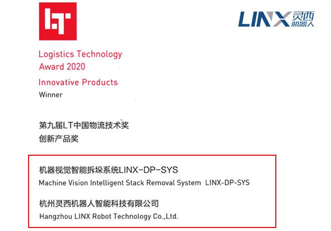 At the 9th LT China Logistics Technology Awards ceremony, LINX Robot "Machine Vision Intelligent Palleticing System LINX-DP-SYS" won the "2020 9th LT Awards - Innovative Product Award".